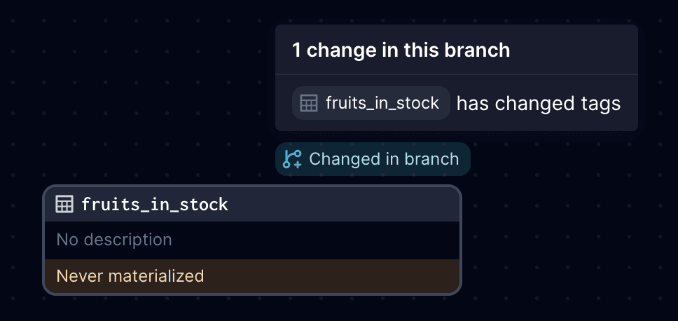 In this example, the fruits_in_stock asset has a Changed in branch label indicating it has changed tags.
